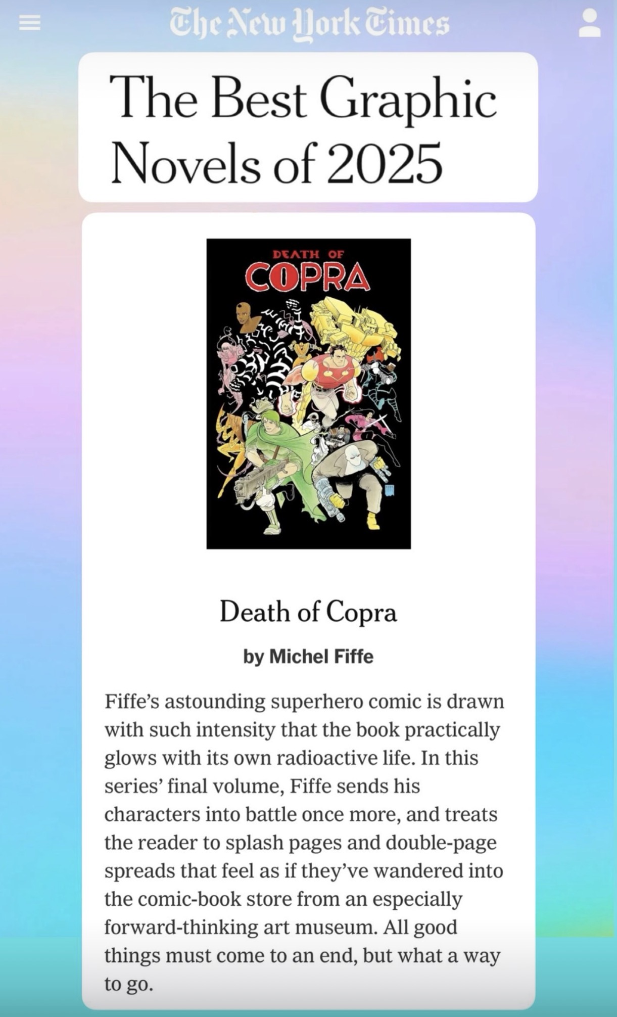 The story of COPRA is one of duality: brutal but tender, bombast as defined by human nuance, crafted with a love of comics history while guided by an eye towards the future.