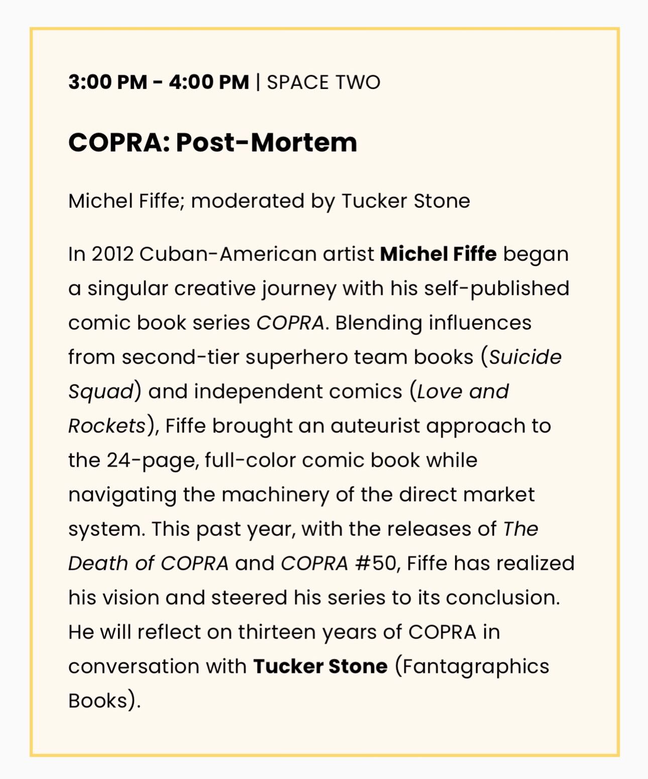 I’m super flattered by this COPRA fanzine. What a sweet, humbling, surreal thing to witness. I’m touched by every word, every line of art. What a gesture.