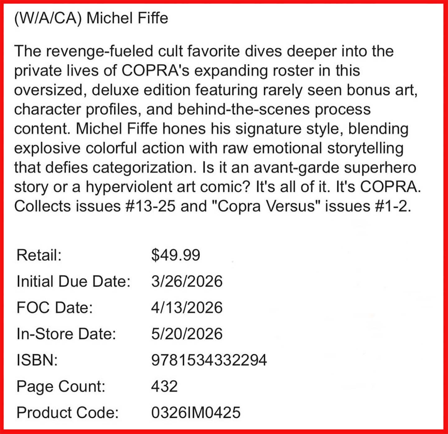 There’s also COPRA: The Last Subscription! The limited edition Subscriber Variant available exclusively via the Copra Press Shop. These are identical to the Image releases, except for the different covers. Supplies are boutique-level rare.